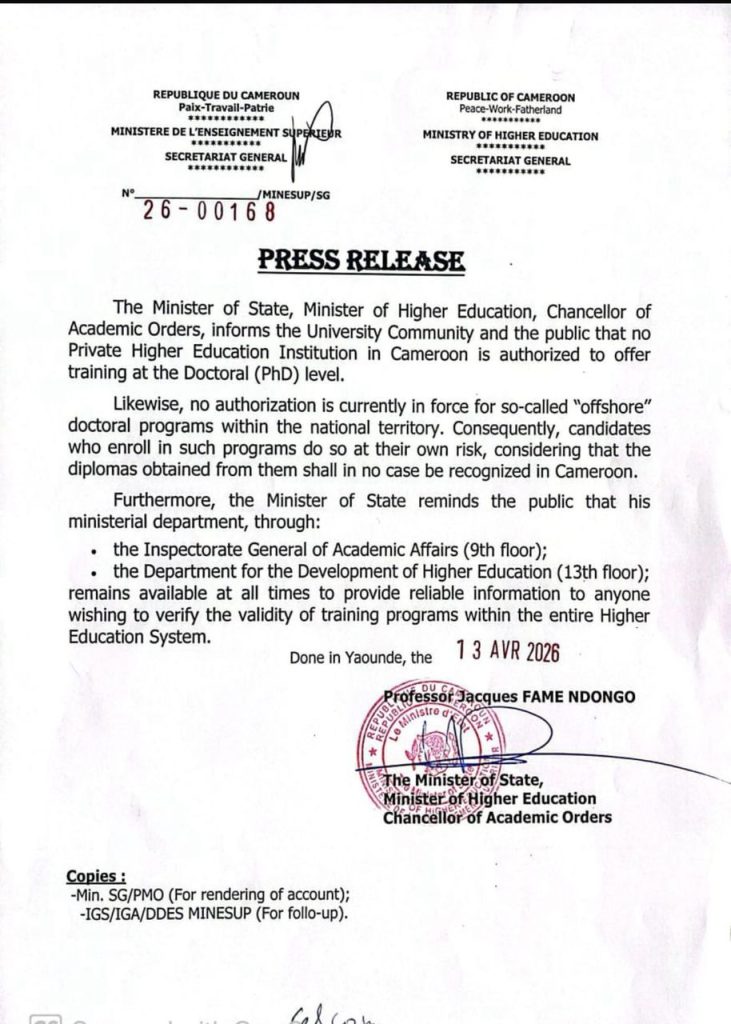 Minister Fame Ndongo also warned that students enrolling in offshore online programs do so entirely at their own risk. The concern from the head of state is not difficult to understand in a country with weak infrastructure and unreliable internet connectivity. With poor internet connectivity, how can any genuine student conduct credible online doctoral research?